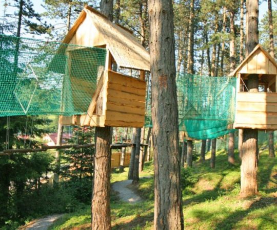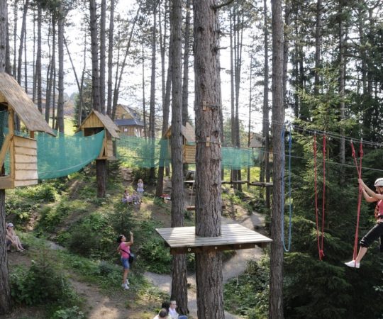 Zažite adrenalín v korunách stromov! Lanový park ponúka prekážky rôznych náročností pre deti aj dospelých chránené v borovicovom lese.